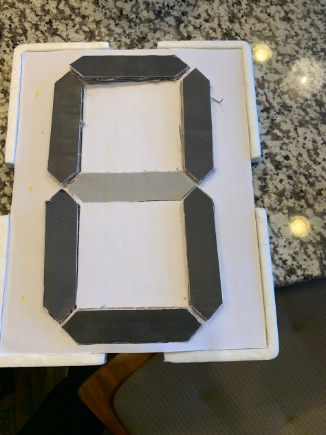 After finding a 7 segment template online. I printed it out and started finding cardboard pieces around the house. I glued the template to a piece of cardboard and cut out the shapes using an exacto knife.