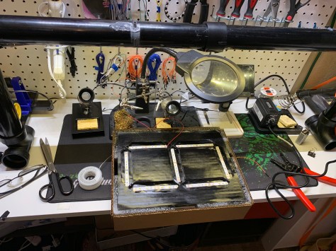 I spray painted the cut cardboard pieces black and placed in the LED strips. I saudered wired to the LED strips and tested each section.