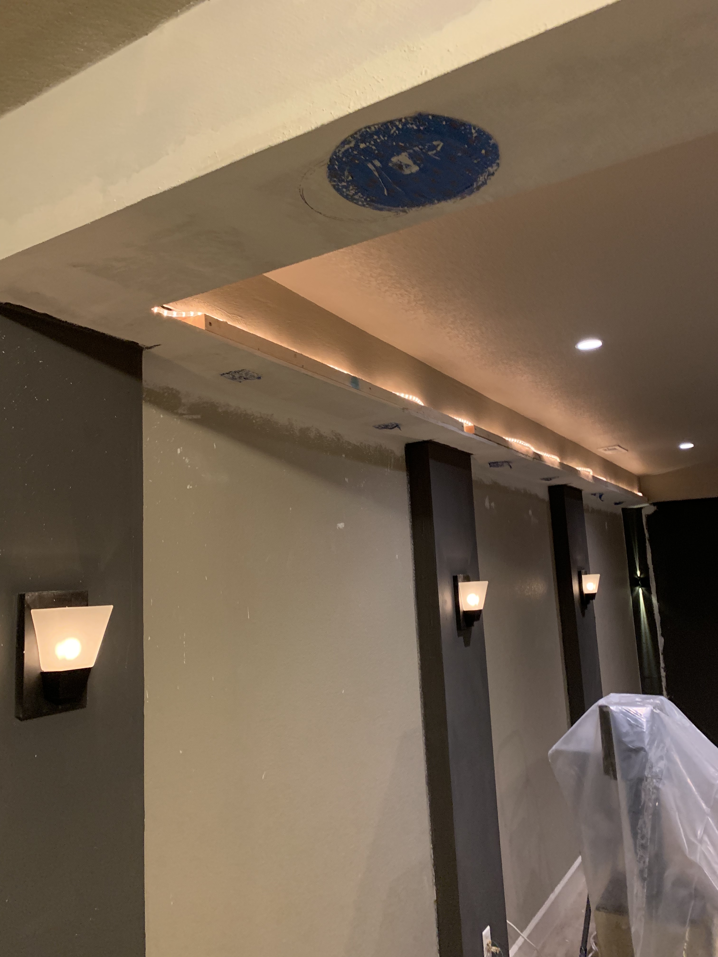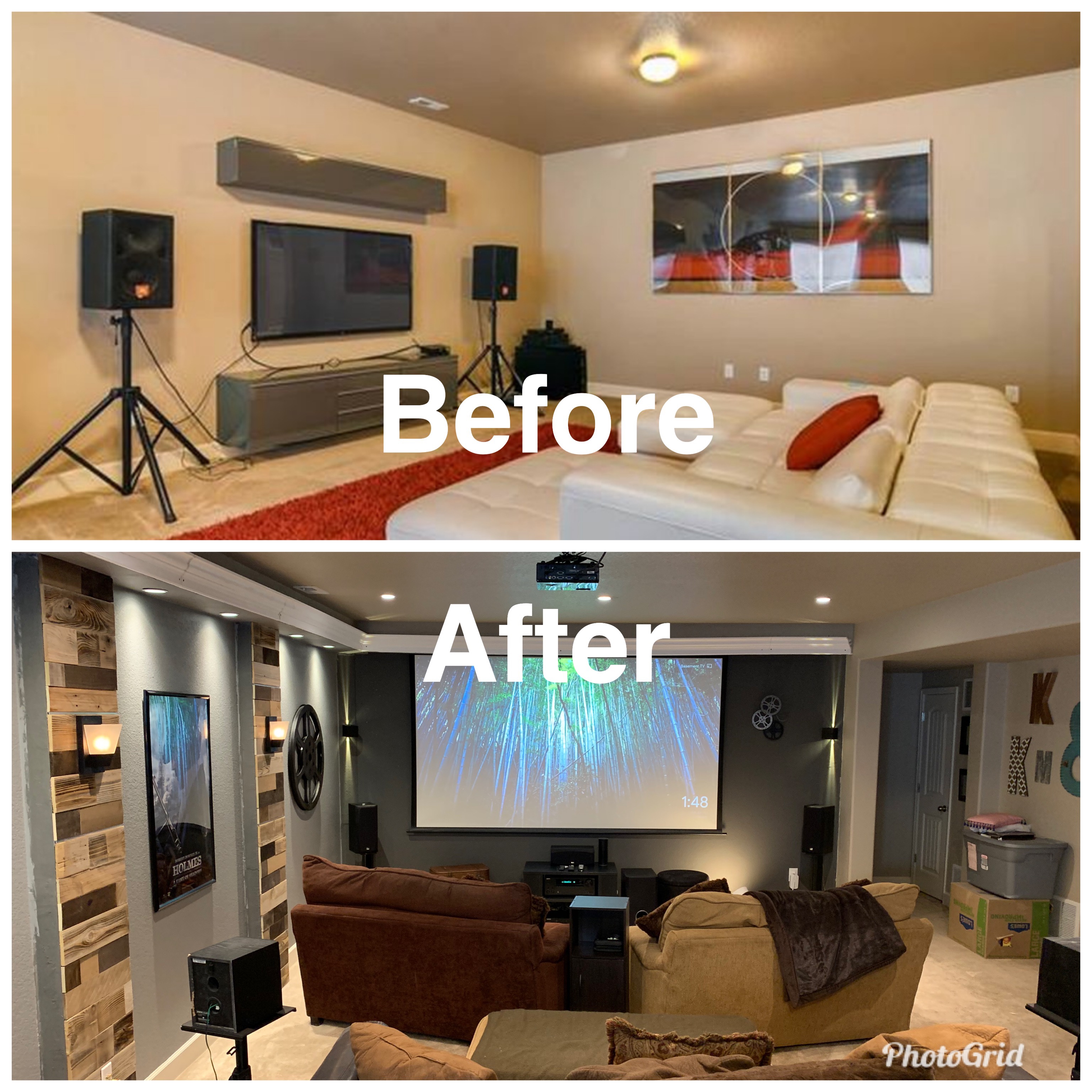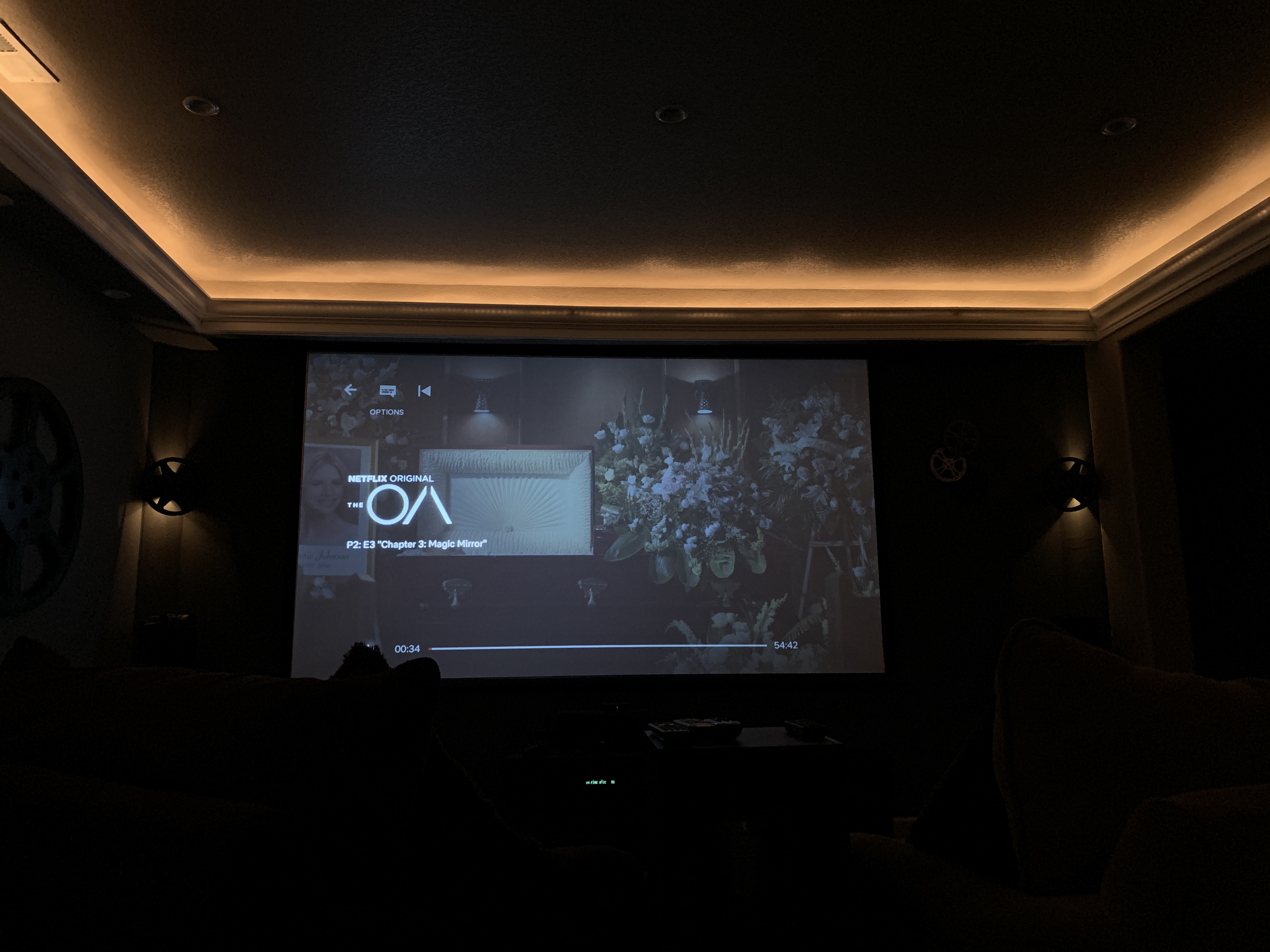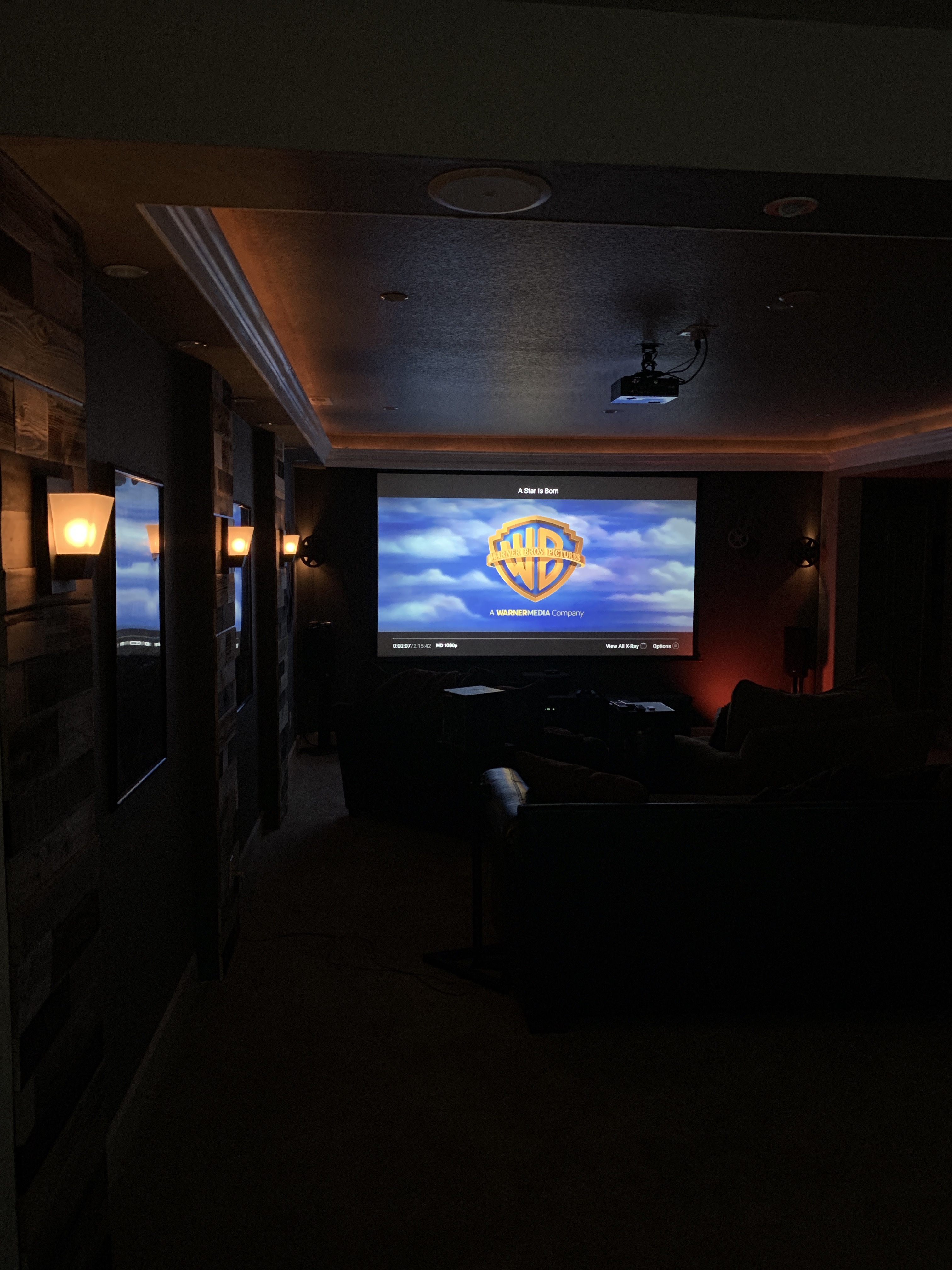 Accent lighting was an emphasis of this build. Notice the reel lights and the glow from the crown molding. Lots of little details with lights are all around the room.Areas where movie bills had to be defined by lights and the built on soffit! That is reclaimed wood that was designed by lorricolorado.com. This helped tie this room into the decors theme of the rest of the house.
